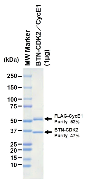 Product Overview : | Full-length human CDK2 [1-298(end) amino acids of accession number NP_001789.2] was co-expressed as N-terminal DYKDDDDK tagged, biotinylated protein (38 kDa) with CyclinE1 [1-410(end) amino acids of accession number NP_001229.1] using baculovirus expression system. The protein was purified by using DYKDDDDK tag antibody agarose. |