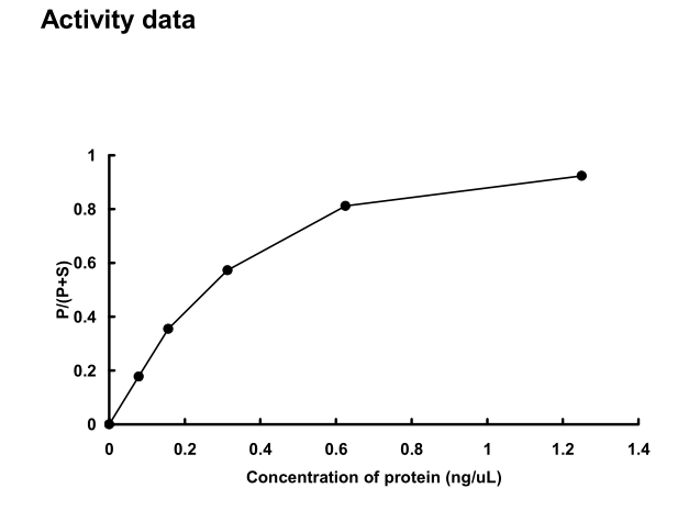 | Bio-activity : | The activity was measured by off-chip mobility shift assay. The enzyme was incubated with fluorecence-labeled substrate and Mg(or Mn)/ATP. The phosphorylated and unphosphorylated substrates were separated and detected by LabChip™3000. |