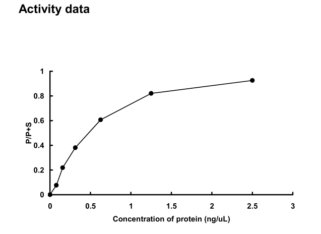 | Bio-activity : | The activity was measured by off-chip mobility shift assay. The enzyme was incubated with fluorecence-labeled substrate and Mg(or Mn)/ATP. The phosphorylated and unphosphorylated substrates were separated and detected by LabChip™3000. |