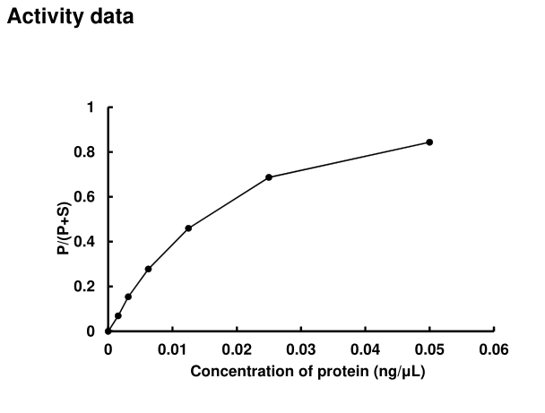 | Bio-activity : | The activity was measured by off-chip mobility shift assay(MSA). The enzyme was incubated with fluorecence-labeled substrate and Mg(or Mn)/ATP. The phosphorylated and unphosphorylated substrates were separated and detected by MSA device. |