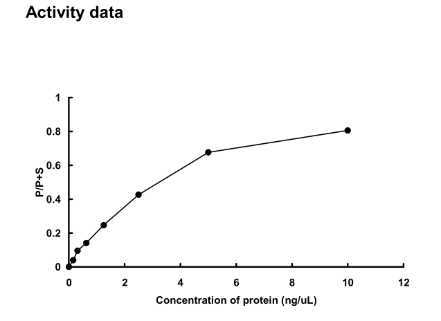 | Bio-activity : | The activity was measured by off-chip mobility shift assay. The enzyme was incubated with fluorecence-labeled substrate and Mg(or Mn)/ATP. The phosphorylated and unphosphorylated substrates were separated and detected by LabChip™3000. |
