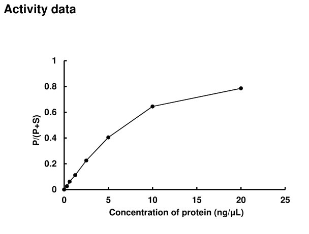 | Bio-activity : | The activity was measured by off-chip mobility shift assay(MSA). The enzyme was incubated with fluorecence-labeled substrate and Mg(or Mn)/ATP. The phosphorylated and unphosphorylated substrates were separated and detected by MSA device. |