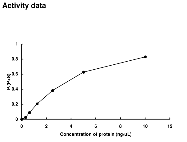 | Bio-activity : | The activity was measured by off-chip mobility shift assay(MSA). The enzyme was incubated with fluorecence-labeled substrate and Mg(or Mn)/ATP. The phosphorylated and unphosphorylated substrates were separated and detected by MSA device. |