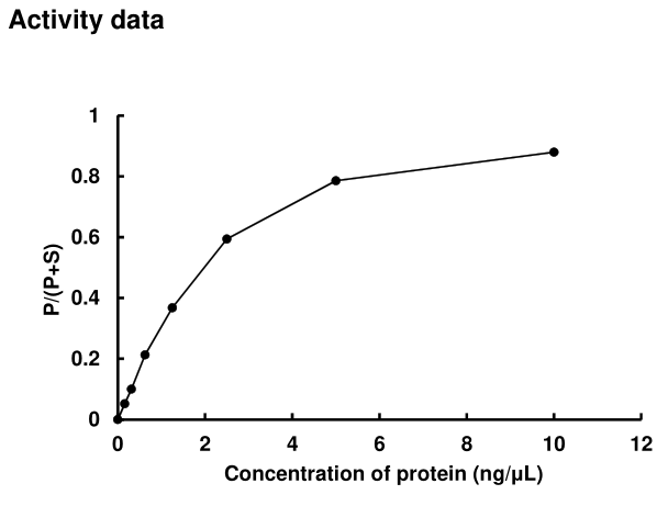 | Bio-activity : | The activity was measured by off-chip mobility shift assay(MSA). The enzyme was incubated with fluorecence-labeled substrate and Mg(or Mn)/ATP. The phosphorylated and unphosphorylated substrates were separated and detected by MSA device. |
