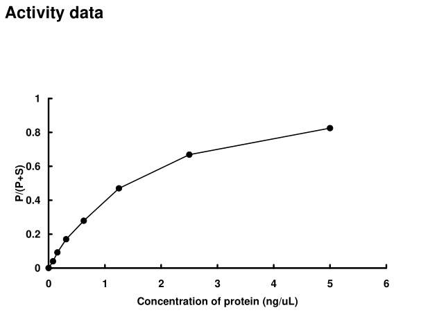 | Bio-activity : | The activity was measured by off-chip mobility shift assay. The enzyme was incubated with fluorecence-labeled substrate and Mg(or Mn)/ATP. The phosphorylated and unphosphorylated substrates were separated and detected by LabChip™3000. |