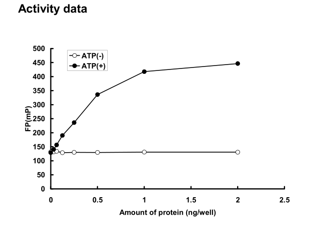 | Bio-activity : | The activity was determined by IMAP™ assay. The enzyme was incubated with fluorescein labeled peptide and phosphorylation was detected by IMAP™ technology (fluorescence polarization). |