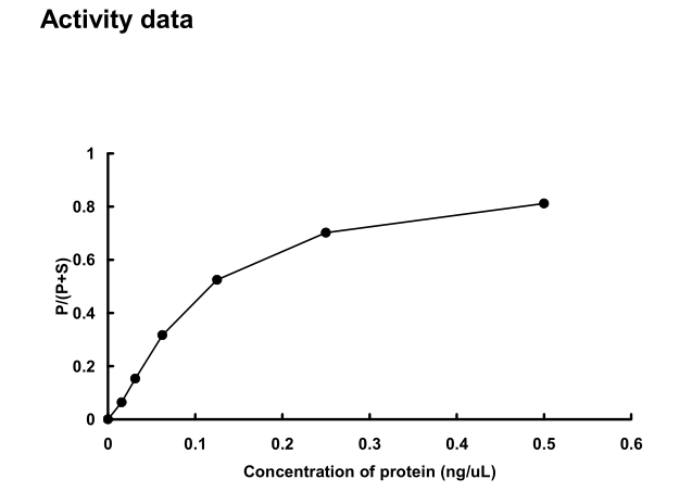 | Bio-activity : | The activity was measured by off-chip mobility shift assay. The enzyme was incubated with fluorecence-labeled substrate and Mg(or Mn)/ATP. The phosphorylated and unphosphorylated substrates were separated and detected by LabChip™3000. |