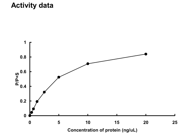 | Bio-activity : | The activity was measured by off-chip mobility shift assay. The enzyme was incubated with fluorecence-labeled substrate and Mg(or Mn)/ATP. The phosphorylated and unphosphorylated substrates were separated and detected by LabChip™3000. |