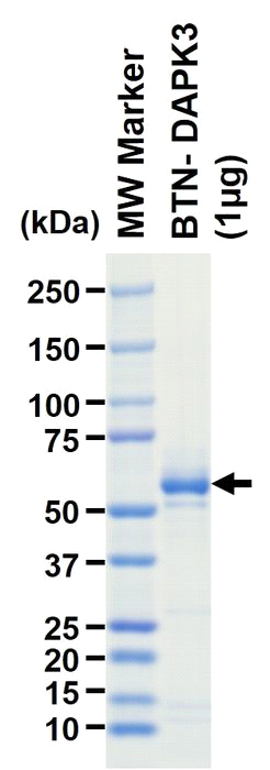 Product Overview : | Full-length human DAPK3 [1-454(end) amino acids of accession number NP_001339.1] was expressed as N-terminal DYKDDDDK tagged, biotinylated protein (56 kDa) using baculovirus expression system. The protein was purified by using DYKDDDDK tag antibody agarose. |