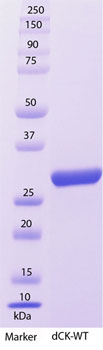 6 IU/mg protein; kcat= 0.05/sec with dC as substrate; One unit of WT human dCK converts 1.0 μmole of dC and ATP to dCMP and ADP per minute at pH 7.5 at 37 centigrade, as measured by a coupled enzyme system with 200 μM dC and 1 mM ATP. |