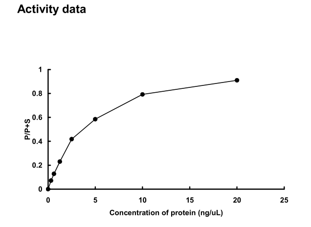 | Bio-activity : | The activity was measured by off-chip mobility shift assay. The enzyme was incubated with fluorecence-labeled substrate, Mg(or Mn)/ATP, and Ca/Calmodulin . The phosphorylated and unphosphorylated substrates were separated and detected by LabChip ™3000. |