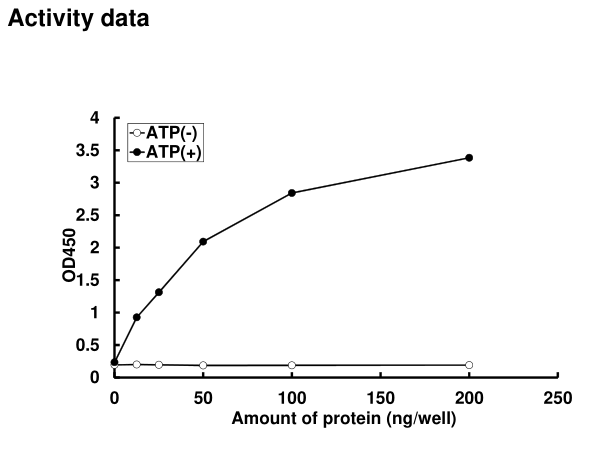 | Bio-activity : | The activity was determined by ELISA. The enzyme was incubated with GST-fused substrate protein and tRNA, and after stopping kinase reaction by EDTA, the reaction solution was transferred into glutathione-coated plate. Phosphorylation was detected by anti- phospho antibody and HRP-labeled anti-rabbit IgG. |