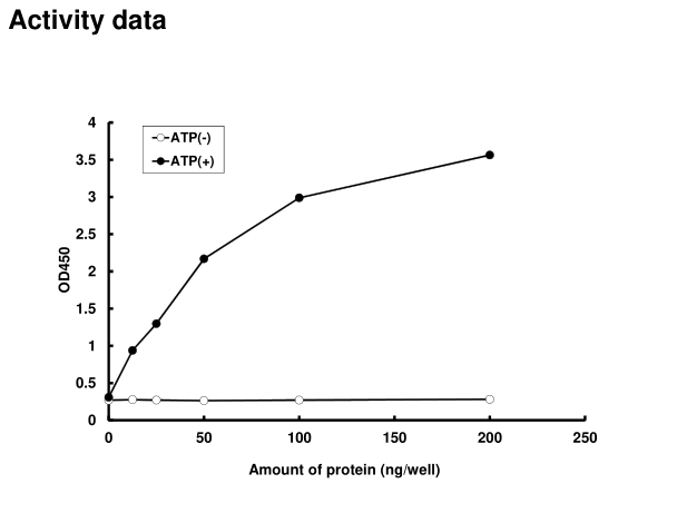| Bio-activity : | The activity was determined by ELISA. The enzyme was incubated with GST-fused substrate protein and tRNA, and after stopping kinase reaction by EDTA, the reaction solution was transferred into glutathione-coated plate. Phosphorylation was detected by anti- phospho antibody and HRP-labeled anti-rabbit IgG. |