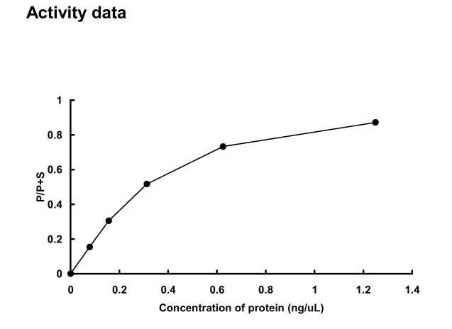 | Bio-activity : | The activity was measured by off-chip mobility shift assay. The enzyme was incubated with fluorecence-labeled substrate and Mg(or Mn)/ATP. The phosphorylated and unphosphorylated substrates were separated and detected by LabChip™3000. |