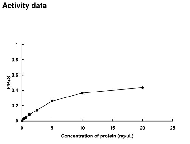 | Bio-activity : | The activity was measured by off-chip mobility shift assay(MSA). The enzyme was incubated with fluorecence-labeled substrate and Mg(or Mn)/ATP. The phosphorylated and unphosphorylated substrates were separated and detected by MSA device. |