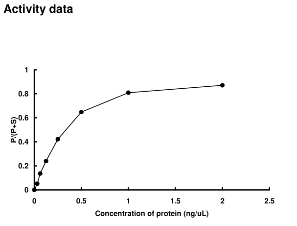 | Bio-activity : | The activity was measured by off-chip mobility shift assay(MSA). The enzyme was incubated with fluorecence-labeled substrate and Mg(or Mn)/ATP. The phosphorylated and unphosphorylated substrates were separated and detected by MSA device. |