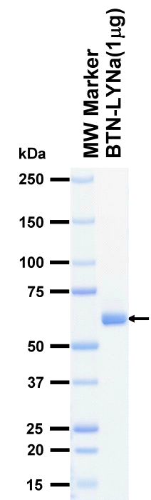 Product Overview : | Full-length human LYNa [1-512(end) amino acids of accession number NP_002341.1] was expressed as N-terminal DYKDDDDK tagged, biotinylated protein (63 kDa) using baculovirus expression system. The protein was purified by using DYKDDDDK tag antibody agarose. |