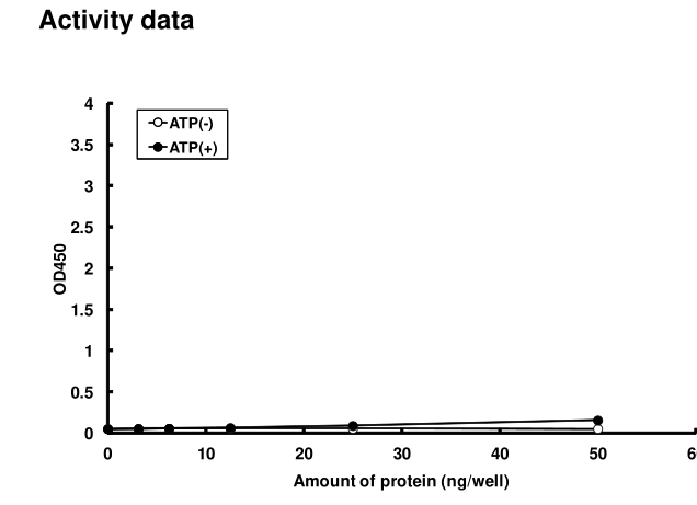 | Bio-activity : | The activity was determined by ELISA. The enzyme was incubated with GST-fused substrate protein, and after stopping kinase reaction by EDTA, the reaction solution was transferred into glutathione-coated plate. Phosphorylation was detected by anti-phospho antibody and HRP-labeled anti-rabbit IgG(or HRP-labeled anti-mouse IgG) . |