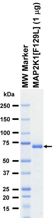 | Product Overview : | Full-length human MAP2K1 [1-393(end) amino acids and F129L of accession number NP_002746.1] was co-expressed as N-terminal GST-fusion protein (70 kDa) with human His-tagged RAF1 [306-648(end) amino acids and Y340D and Y341D of accession number NP_002871.1] using baculovirus expression system. GST-MAP2K1[F129L] was purified by using glutathione sepharose chromatography and Ni-NTA affinity chromatography. |