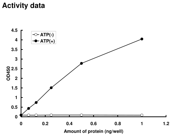 | Bio-activity : | The activity was determined by ELISA. The enzyme was incubated with GST-fused substrate protein, and after stopping kinase reaction by EDTA, the reaction solution was transferred into glutathione-coated plate. Phosphorylation was detected by anti-phospho antibody and HRP-labeled anti-rabbit IgG(or HRP-labeled anti-mouse IgG) . |