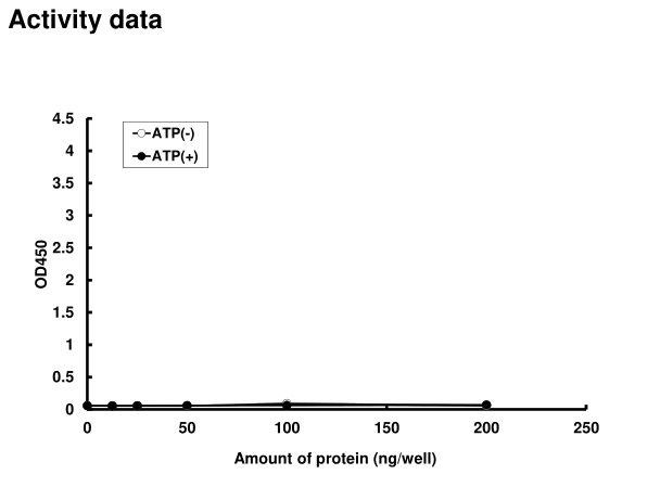 | Bio-activity : | The activity was determined by ELISA. The enzyme was incubated with GST-fused substrate protein, and after stopping kinase reaction by EDTA, the reaction solution was transferred into glutathione- coated plate. Phosphorylation was detected by anti-phospho antibody and HRP-labeled anti-rabbit IgG(or HRP-labeled anti-mouse IgG) . |
