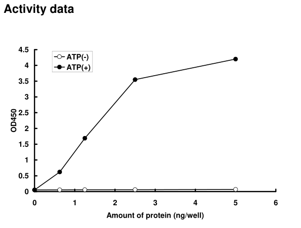 | Bio-activity : | The activity was determined by ELISA. The enzyme was incubated with GST-fused substrate protein, and after stopping kinase reaction by EDTA, the reaction solution was transferred into glutathione- coated plate. Phosphorylation was detected by anti-phospho antibody and HRP-labeled anti-rabbit IgG(or HRP-labeled anti-mouse IgG) . |