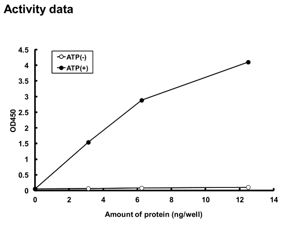 | Bio-activity : | The activity was determined by ELISA. The enzyme was incubated with GST-fused substrate protein, and after stopping kinase reaction by EDTA, the reaction solution was transferred into glutathione- coated plate. Phosphorylation was detected by anti-phospho antibody and HRP-labeled anti-rabbit IgG(or HRP-labeled anti-mouse IgG) . |