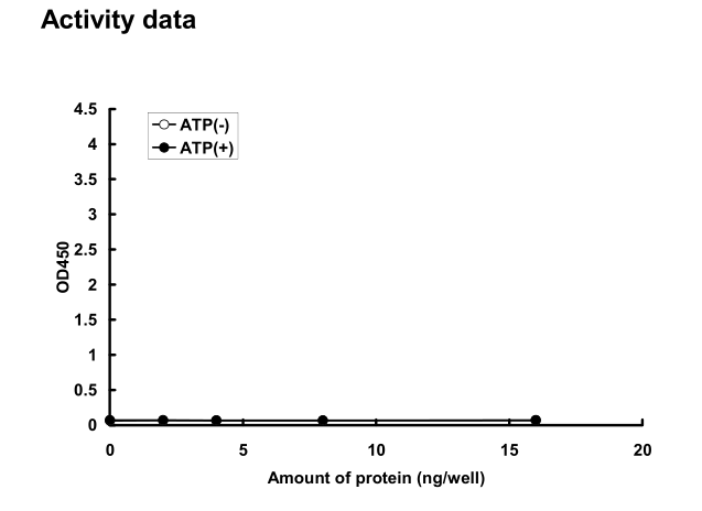 | Bio-activity : | The activity was determined by ELISA. The enzyme was incubated with GST-fused substrate protein, and after stopping kinase reaction by EDTA, the reaction solution was transferred into glutathione- coated plate. Phosphorylation was detected by anti-phospho antibody and HRP-labeled anti-rabbit IgG. |