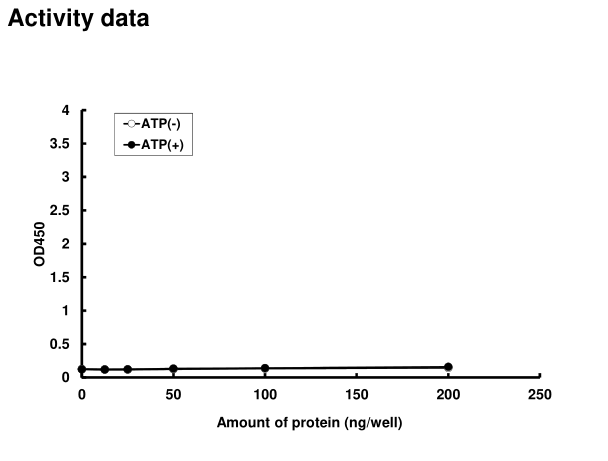 | Bio-activity : | The activity was determined by ELISA. The enzyme was incubated with GST-fused substrate protein, and after stopping kinase reaction by EDTA, the reaction solution was transferred into glutathione- coated plate. Phosphorylation was detected by anti-phospho antibody and HRP-labeled anti-rabbit IgG(or HRP-labeled anti-mouse IgG) . |
