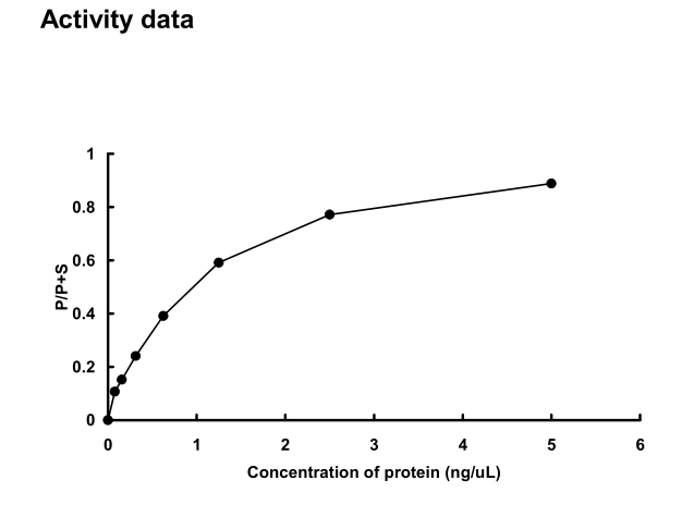 | Bio-activity : | The activity was measured by off-chip mobility shift assay. The enzyme was incubated with fluorecence-labeled substrate and Mg(or Mn)/ATP. The phosphorylated and unphosphorylated substrates were separated and detected by LabChip™3000. |