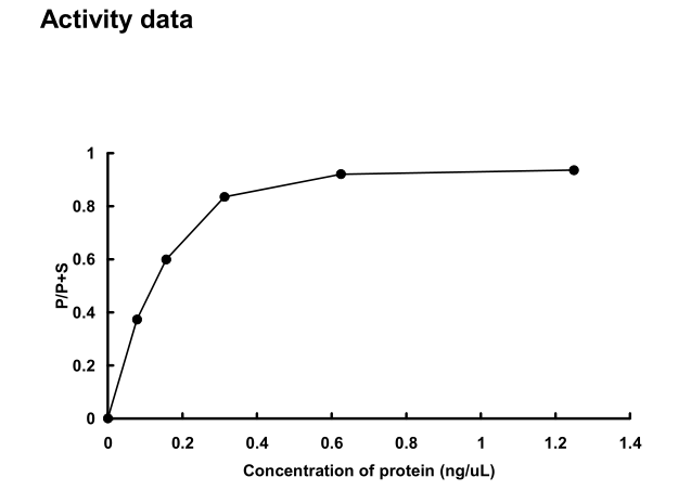 | Bio-activity : | The activity was measured by off-chip mobility shift assay. The enzyme was incubated with fluorecence-labeled substrate and Mg(or Mn)/ATP. The phosphorylated and unphosphorylated substrates were separated and detected by LabChip™3000. |