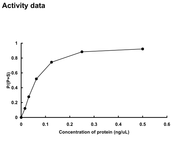 | Bio-activity : | The activity was measured by off-chip mobility shift assay. The enzyme was incubated with fluorecence-labeled substrate and Mg(or Mn)/ATP. The phosphorylated and unphosphorylated substrates were separated and detected by LabChip™3000. |
