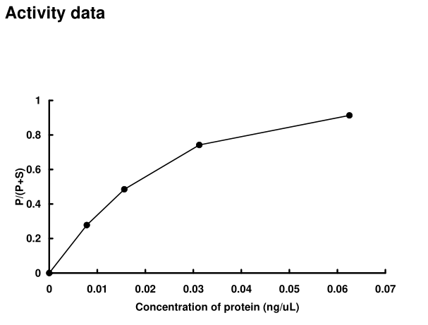| Bio-activity : | The activity was measured by off-chip mobility shift assay. The enzyme was incubated with fluorecence-labeled substrate and Mg(or Mn)/ATP. The phosphorylated and unphosphorylated substrates were separated and detected by LabChip™3000. |
