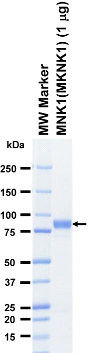 Product Overview : | Full-length human MNK1 [1-424(end) amino acids and T344D of accession number NP_001129025.1] was expressed as N-terminal GST-fusion protein (74 kDa) using baculovirus expression system. GST- MNK1 was purified by using glutathione sepharose chromatography. |