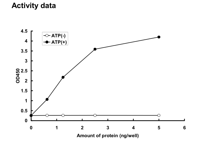 | Bio-activity : | The activity was determined by ELISA. The enzyme was incubated with biotinylated substrate protein, and after stopping kinase reaction by EDTA, the reaction solution was transferred into streptavidin- coated plate. Phosphorylation was detected by anti-phospho antibody and HRP-labeled anti-rabbit IgG. |