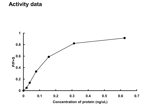 | Bio-activity : | The activity was measured by off-chip mobility shift assay. The enzyme was incubated with fluorecence-labeled substrate and Mg(or Mn)/ATP. The phosphorylated and unphosphorylated substrates were separated and detected by LabChip™3000. |