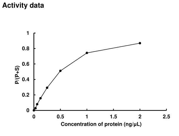 | Bio-activity : | The activity was measured by off-chip mobility shift assay(MSA). The enzyme was incubated with fluorecence-labeled substrate and Mg(or Mn)/ATP. The phosphorylated and unphosphorylated substrates were separated and detected by MSA device. |