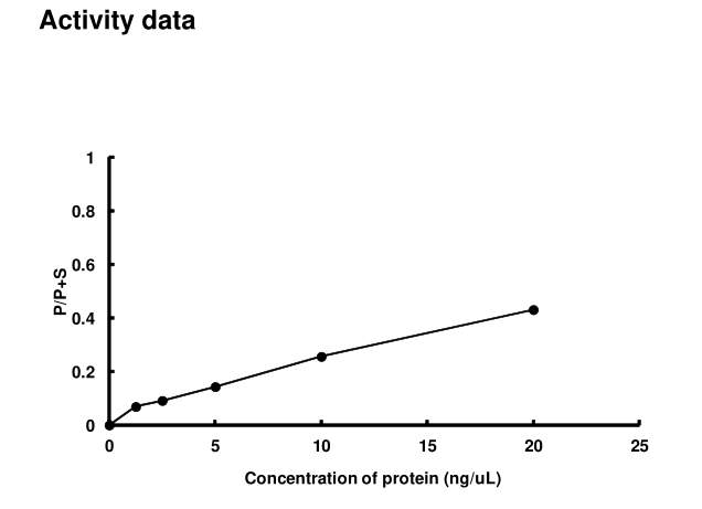 | Bio-activity : | The activity was measured by off-chip mobility shift assay. The enzyme was incubated with fluorecence-labeled substrate and Mg(or Mn)/ATP. The phosphorylated and unphosphorylated substrates were separated and detected by LabChip™3000. |