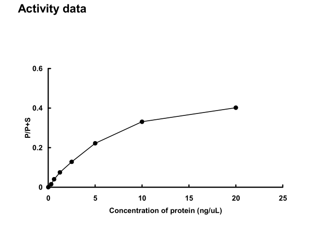 | Bio-activity : | The activity was measured by off-chip mobility shift assay. The enzyme was incubated with fluorecence-labeled substrate and Mg(or Mn)/ATP. The phosphorylated and unphosphorylated substrates were separated and detected by LabChip™3000. |