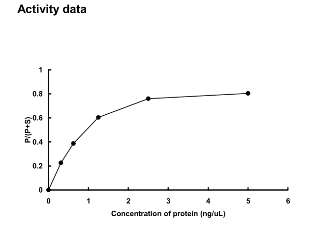 | Bio-activity : | The activity was measured by off-chip mobility shift assay. The enzyme was incubated with fluorecence-labeled substrate and Mg(or Mn)/ATP. The phosphorylated and unphosphorylated substrates were separated and detected by LabChip™3000. |