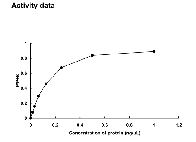 | Bio-activity : | The activity was measured by off-chip mobility shift assay. The enzyme was incubated with fluorecence-labeled substrate and Mg(or Mn)/ATP. The phosphorylated and unphosphorylated substrates were separated and detected by LabChip™3000. |