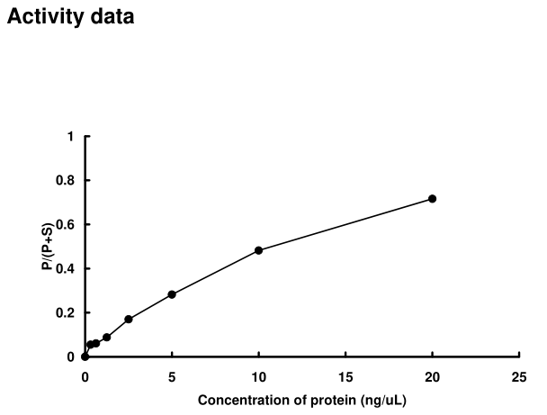 | Bio-activity : | The activity was measured by off-chip mobility shift assay(MSA). The enzyme was incubated with fluorecence-labeled substrate and Mg(or Mn)/ATP. The phosphorylated and unphosphorylated substrates were separated and detected by MSA device. |