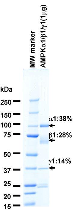 | Product Overview : | Full-length human AMPKα1 [1-550(end) amino acids of accession number NP_006242.4] was co- expressed as N-terminal GST-fusion protein (90 kDa) with GST-PRKAB1 [1-270(end) amino acids of accession number NP_006244.2] and PRKAG1 [1-331(end) amino acids of accession number NP_002724.1] using baculovirus expression system. GST-AMPKα1/β1/γ1 was purified by using glutathione sepharose chromatography and activated with His-tagged CaMKK1. Activated GST- AMPKα1/β1/γ1 was purified using glutathione sepharose chromatography. |