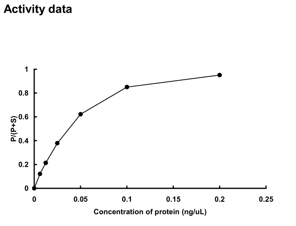 | Bio-activity : | The activity was measured by off-chip mobility shift assay. The enzyme was incubated with fluorecence-labeled substrate, Mg(or Mn)/ATP, and Lipid Activator. The phosphorylated and unphosphorylated substrates were separated and detected by LabChip™3000. |