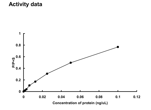 | Bio-activity : | The activity was measured by off-chip mobility shift assay. The enzyme was incubated with fluorecence-labeled substrate and Mg(or Mn)/ATP. The phosphorylated and unphosphorylated substrates were separated and detected by LabChip™3000. |