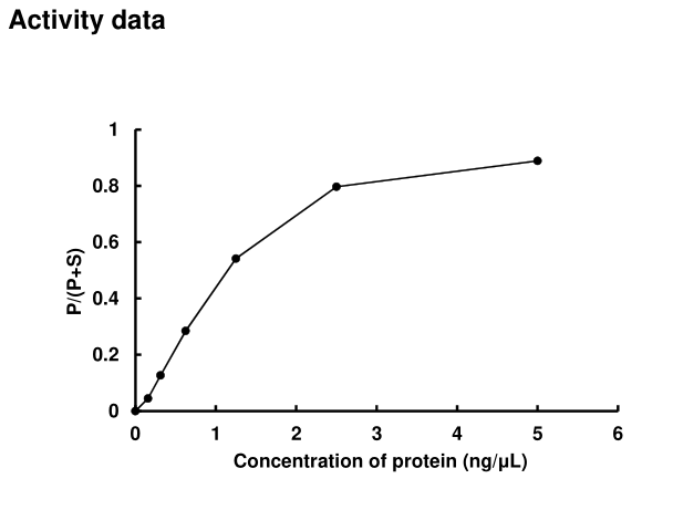 | Bio-activity : | The activity was measured by off-chip mobility shift assay(MSA). The enzyme was incubated with fluorecence-labeled substrate and Mg(or Mn)/ATP. The phosphorylated and unphosphorylated substrates were separated and detected by MSA device. |