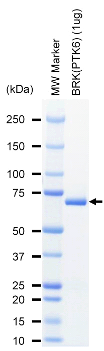 | Product Overview : | Full-length human BRK [2-451(end) amino acids of accession number NP_005966.1] was expressed as N- terminal GST-fusion protein (79 kDa) using baculovirus expression system. GST-BRK was purified by using glutathione sepharose chromatography. |