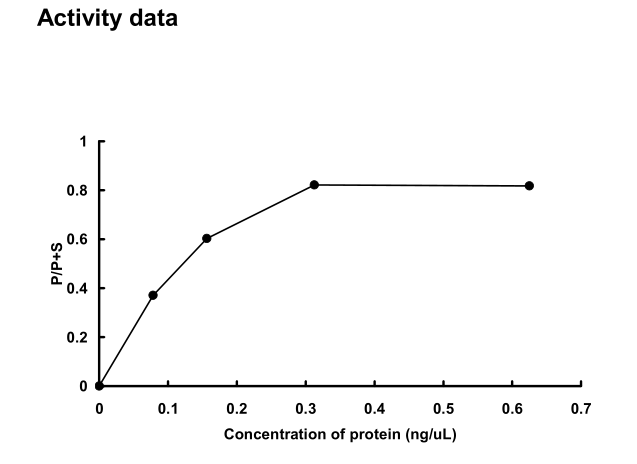 | Bio-activity : | The activity was measured by off-chip mobility shift assay. The enzyme was incubated with fluorecence-labeled substrate and Mg(or Mn)/ATP. The phosphorylated and unphosphorylated substrates were separated and detected by LabChip™3000. |