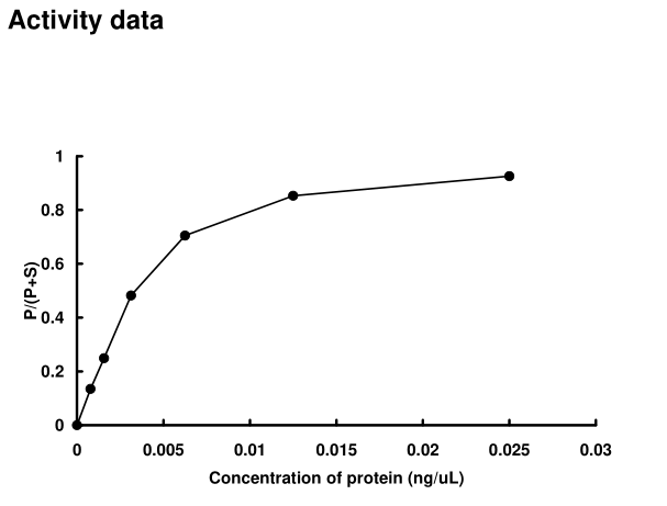 | Bio-activity : | The activity was measured by off-chip mobility shift assay. The enzyme was incubated with fluorecence-labeled substrate and Mg(or Mn)/ATP. The phosphorylated and unphosphorylated substrates were separated and detected by LabChip™3000. |