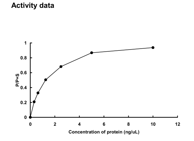 | Bio-activity : | The activity was measured by off-chip mobility shift assay. The enzyme was incubated with fluorecence-labeled substrate and Mg(or Mn)/ATP. The phosphorylated and unphosphorylated substrates were separated and detected by LabChip™3000. |